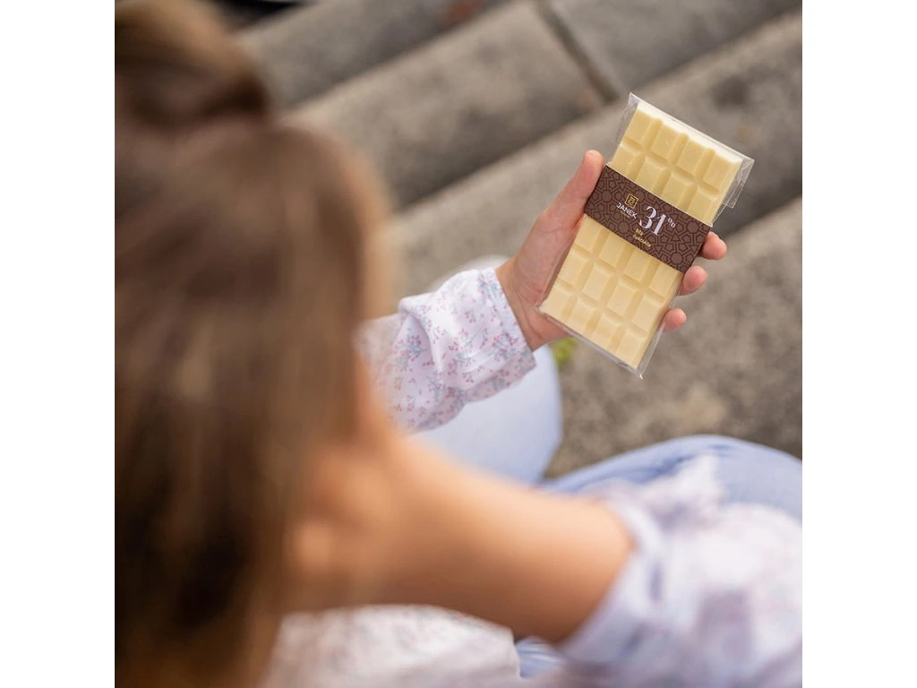 Jemná bílá čokoláda provoněná vanilkou. Žádnými aromaty nebo esencemi. Ale zrníčky pravé vanilky. Voní, křupe a zároveň se pomalu rozplyne na jazyku.