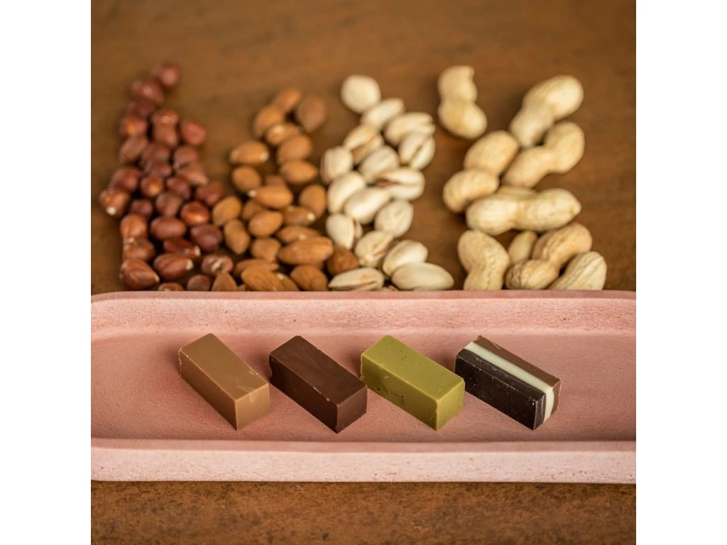 Složení: Arašídy (rozmělněné),pistácie, lískový ořech, mandle, bílá čokoláda, mléčná čokoláda, hořká čokoláda (kakaová hmota, kakaové máslo, cukr, sušené mléko, přírodní vanilka).