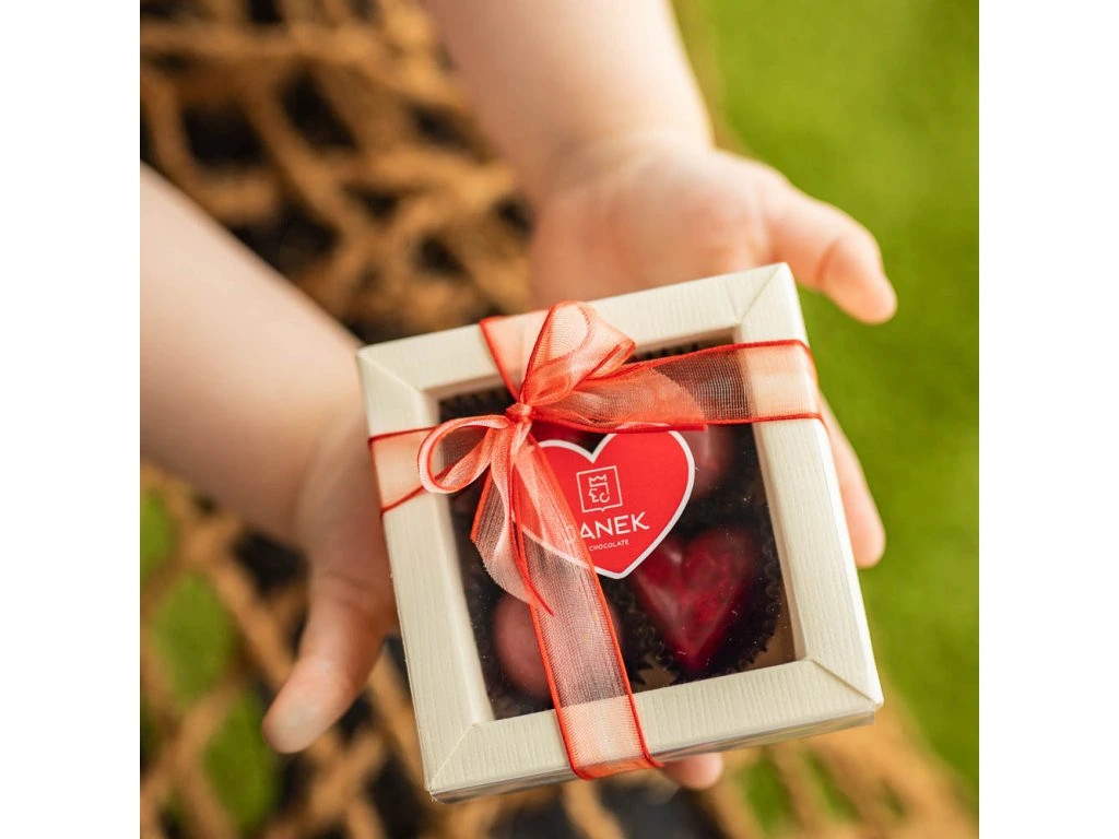 Krabička obsahuje 4 pralinky. Srdíčka obsahující oblíbenou lískovku a limitované rybízové pralinky v ruby čokoládě.