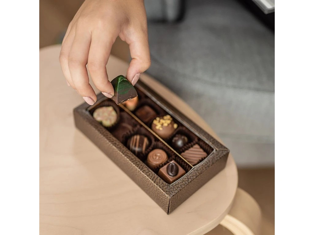 Krabička naplněná těmi nejprodávanějšími kousky. (irská káva, levandule, karamel, slaný karamel, nugát, lanýž med a skořice, lískový ořech, jablečný karamel, malina, jahoda)