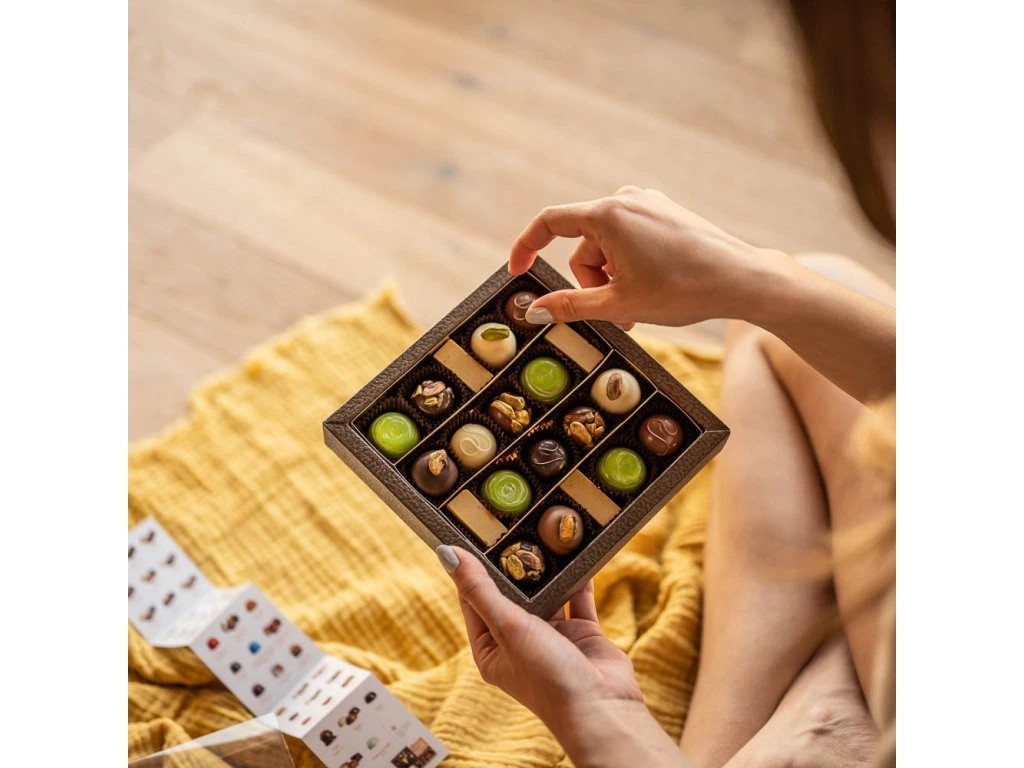 Krabička plná čokoládových pistáciových jednohubek. To je mňamka.