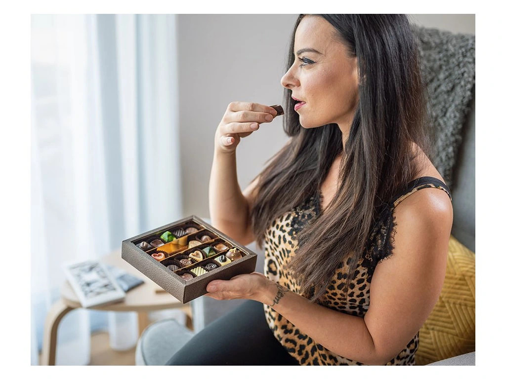 Krabička naplněná těmi nejprodávanějšími kousky. (irská káva, levandule, karamel, slaný karamel, nugát, lanýž med a skořice, lískový ořech, jablečný karamel, malina, jahoda)