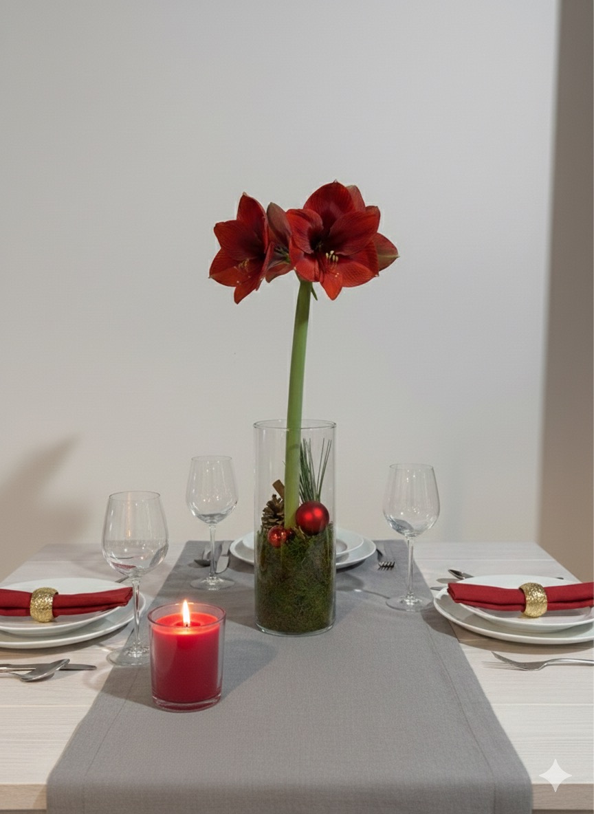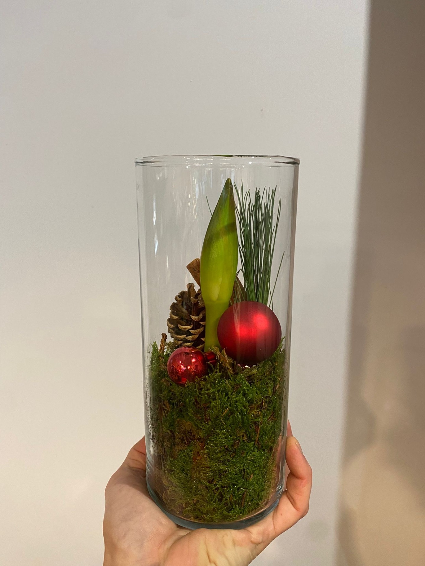 Majestátní sytě červený Amarylis se tyčí z moderní skleněné vázy. Základ je tvořen zeleným mechem a je dozdoben vánočními ozdobami a šiškami. Dekorace obsahuje živou cibuli amaryllisu, která postupně roste a rozkvétá. Ozdoba tak není jen na chvíli – může vám dělat radost celé týdny a lze ji dále pěstovat i po sezóně.