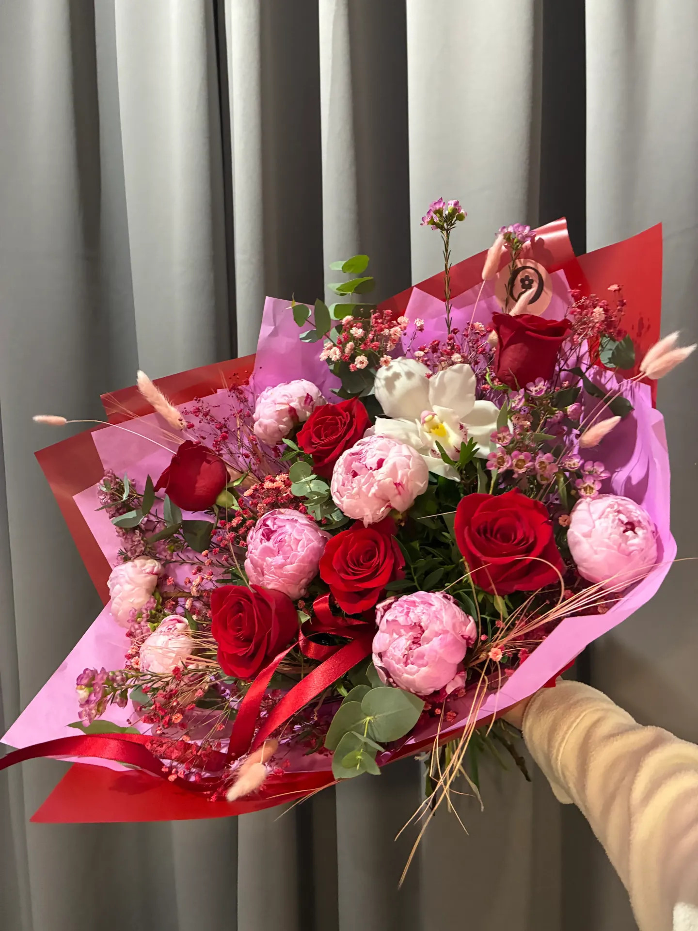Sezonní kytice s pivoňkami a červenými růžemi. Dostupná ve více velikostech.